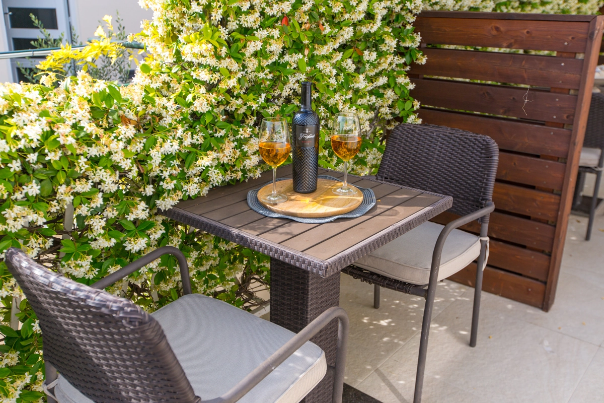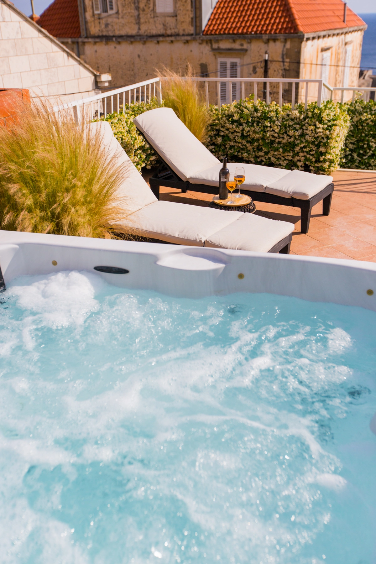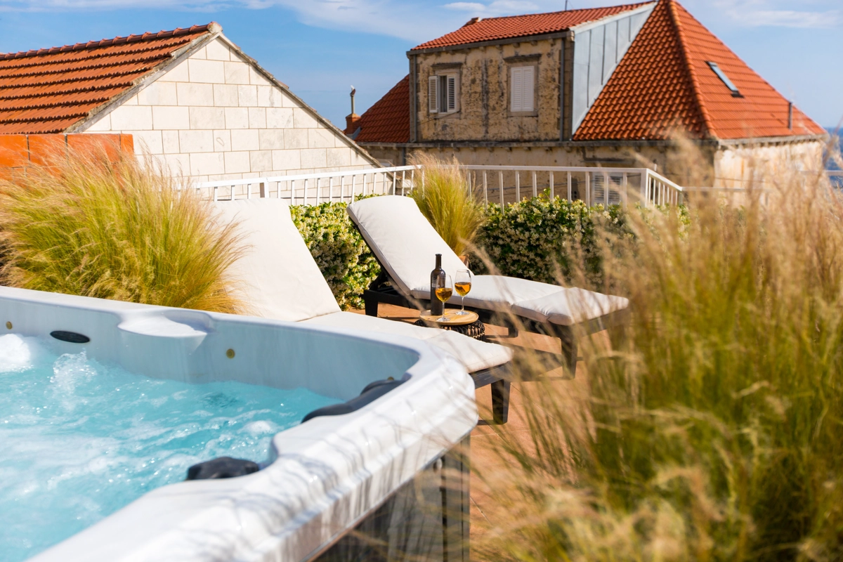 A spacious shared terrace fitted with sun beds and parasols as well as shared hot tub are at your disposal, which makes this place ideal for a nice and relaxing family or friends vacation.