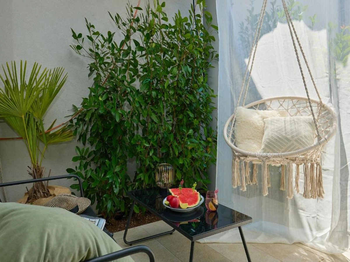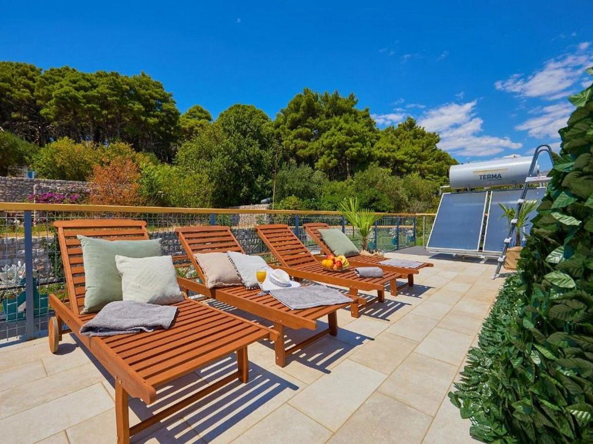 Shared terrace fitted with sun beds and parasols as well as a common seasonal outdoor swimming pool are at your disposal, which makes this place ideal for a nice and relaxing family or friends vacation.